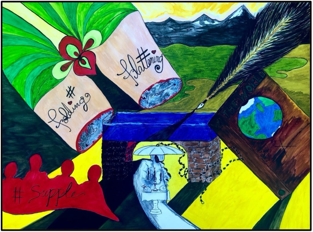 Here the assemblage is represented by the coming together of an arch. Red bricks, wood two-by-fours, and a glass fish tank unite. Beneath the arch is the entrance and exit of the threshold, where a hand is holding a bathtub plug. The torso of a woman sits in the top left. Her legs severed at mid-thigh, revealing a pair of blue-grey dream spaces with the hands and numbers of clock faces. Two tattoos read #folding and #flattening to represent the process by which new ideas are found within the folds of deconstruction and reterritorialization. The landscape of green pastures and glowing mountain-scape emphasize the connections between these ideas and the movements of literal and figurative “decolonization of territories.”